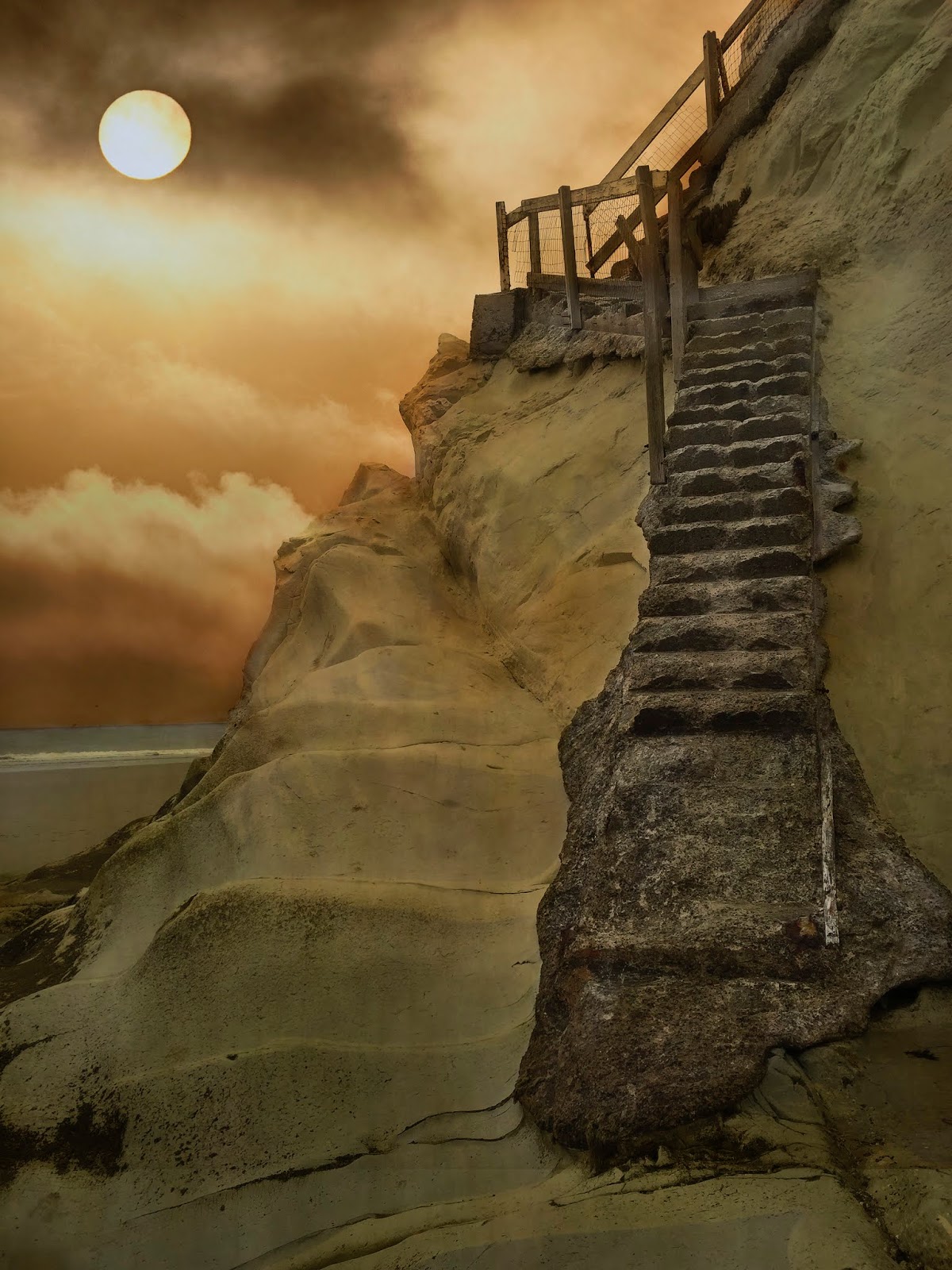 One of my favorite shots. I came across these old stairs that at one time allowed people access to the beach from the bluffs above. The ocean and her tides had a different idea, making these stairs no longer usable. That looks like the moon, but it's actually the sun viewed through fog and clouds.