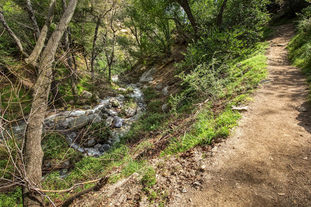 From nearly the start of the hike, I could hear a background "drone" noise that I couldn't identify. I figured it must be freeway traffic, but as I hiked up the trail, it got louder. It finally dawned on me that it's the sound of water rushing down the canyon! All the recent rain has turned what is usually a little trickle into significant water flow. In the photo above, you can see a section of the trail I've just hiked up with the canyon down below. You can't really see any water flowing from this view, but it's down there and you can hear it!